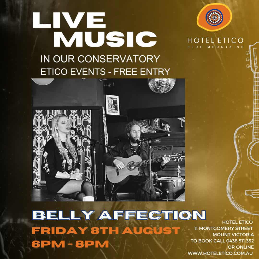 Chris Emmerson and Rachael Rae have been writing and playing together as Blue Mountains music duo, Belly Affection, for several years now. Performing original music and playing from the soul, they explore torment and seduction in a dreamy folk-pop style. Float away to the sound of their sweet harmonies or become entranced by their transcendent lyrics.