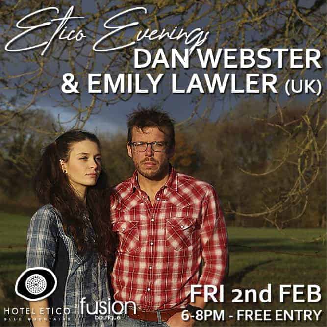 Fusion Boutique Presents is very pleased to announce the next ‘ETICO EVENINGS’ showcase series in the conservatory of Hotel Etico Australia at Mount Victoria Manor w/ DAN WEBSTER & EMILY LAWLER – a folk/Americana/roots duo touring from the UK. FRI 2nd FEB 2024 6-8pm (FREE ENTRY!)