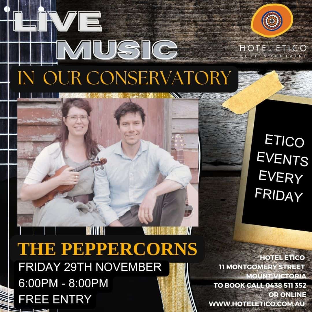 The Peppercorns play folk acoustic guitar and fiddle with warm vocal harmonies. Their music draws on old timey, Americana and blues traditions. Hailing originally from Western Australia, this duo has carved out a sound that echoes wide expansive landscapes, and an ache for the elemental.