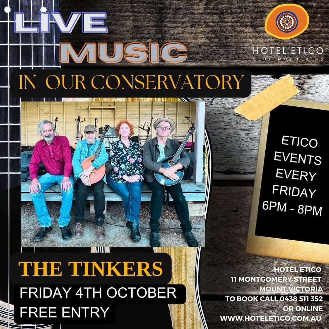 THE TINKERS. A dynamic and entertaining band that specialises in Irish music and lots of other folk styles. Band members include, Jim Mogine, guitarist (Midnight Oil) Alan Healy ( Shameless Seamus and the Tullamore Dews) Tinker Duffy, excellent accordionist. All who have shared the stage with the cream of international Folk bands in their careers as professional musicians. Their instruments include, mandocello banjo accordion guitar fiddle vocals and Bodhron (Irish traditional drum).