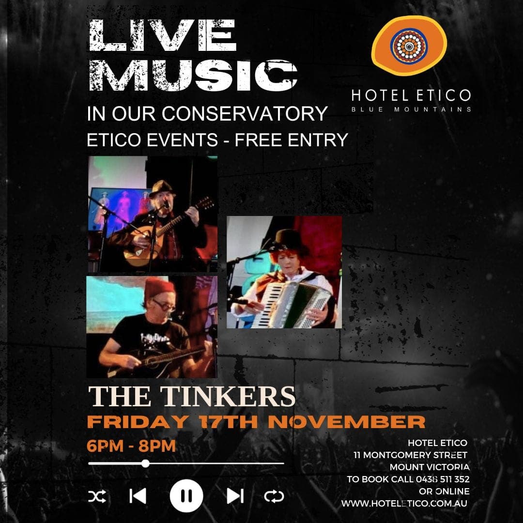 THE TINKERS. A dynamic and entertaining band that specialises in Irish music and lots of other folk styles. Band members include, Jim Mogine, guitarist (midnight oil) Alan Healy ( shameless Seamus and the Tullamore dews) tinker duffy, excellent accordionist. All who have shared the stage with the cream of international Folk bands in their careers as professional musicians. Their instruments include, mandocello banjo accordion guitar fiddle vocals and Bodhron (Irish traditional drum).