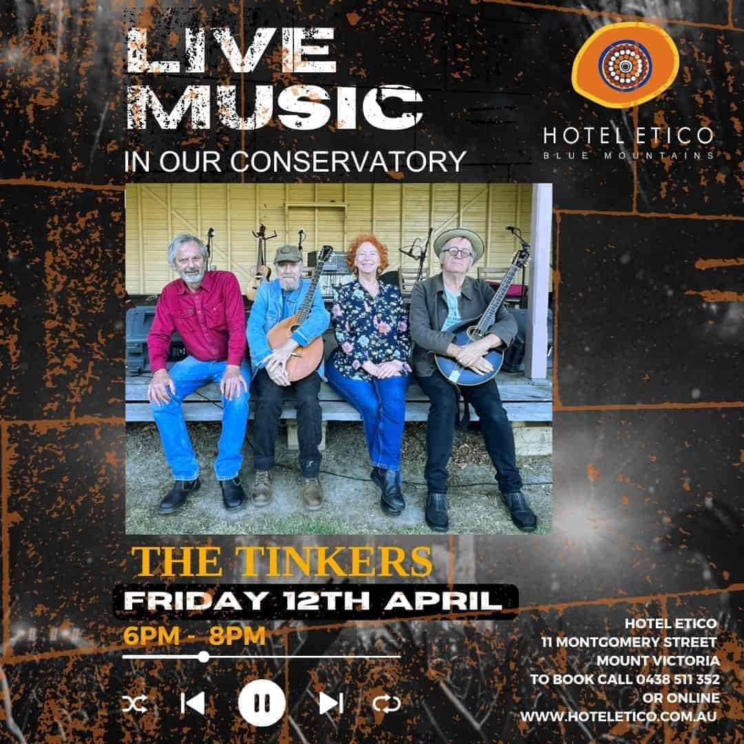 THE TINKERS. A dynamic and entertaining band that specialises in Irish music and lots of other folk styles. Band members include, Jim Mogine, guitarist (midnight oil) Alan Healy ( shameless Seamus and the Tullamore dews) tinker duffy, excellent accordionist. All who have shared the stage with the cream of international Folk bands in their careers as professional musicians. Their instruments include, mandocello banjo accordion guitar fiddle vocals and Bodhron (Irish traditional drum).  This is a fabulous night of foot tapping music!