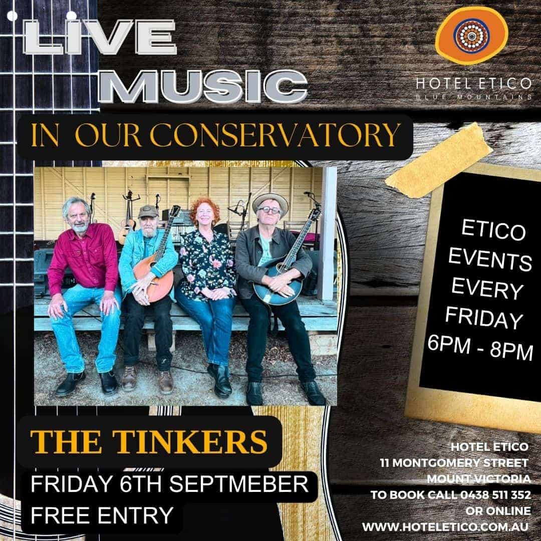 THE TINKERS. A dynamic and entertaining band that specialises in Irish music and lots of other folk styles. Band members include, Jim Mogine, guitarist (Midnight Oil) Alan Healy ( shameless Seamus and the Tullamore dews) , Tinker Duffy, excellent accordionist. All who have shared the stage with the cream of international Folk bands in their careers as professional musicians. Their instruments include, mandocello banjo accordion guitar fiddle vocals and Bodhron (Irish traditional drum). This is a fabulous night of foot tapping music!