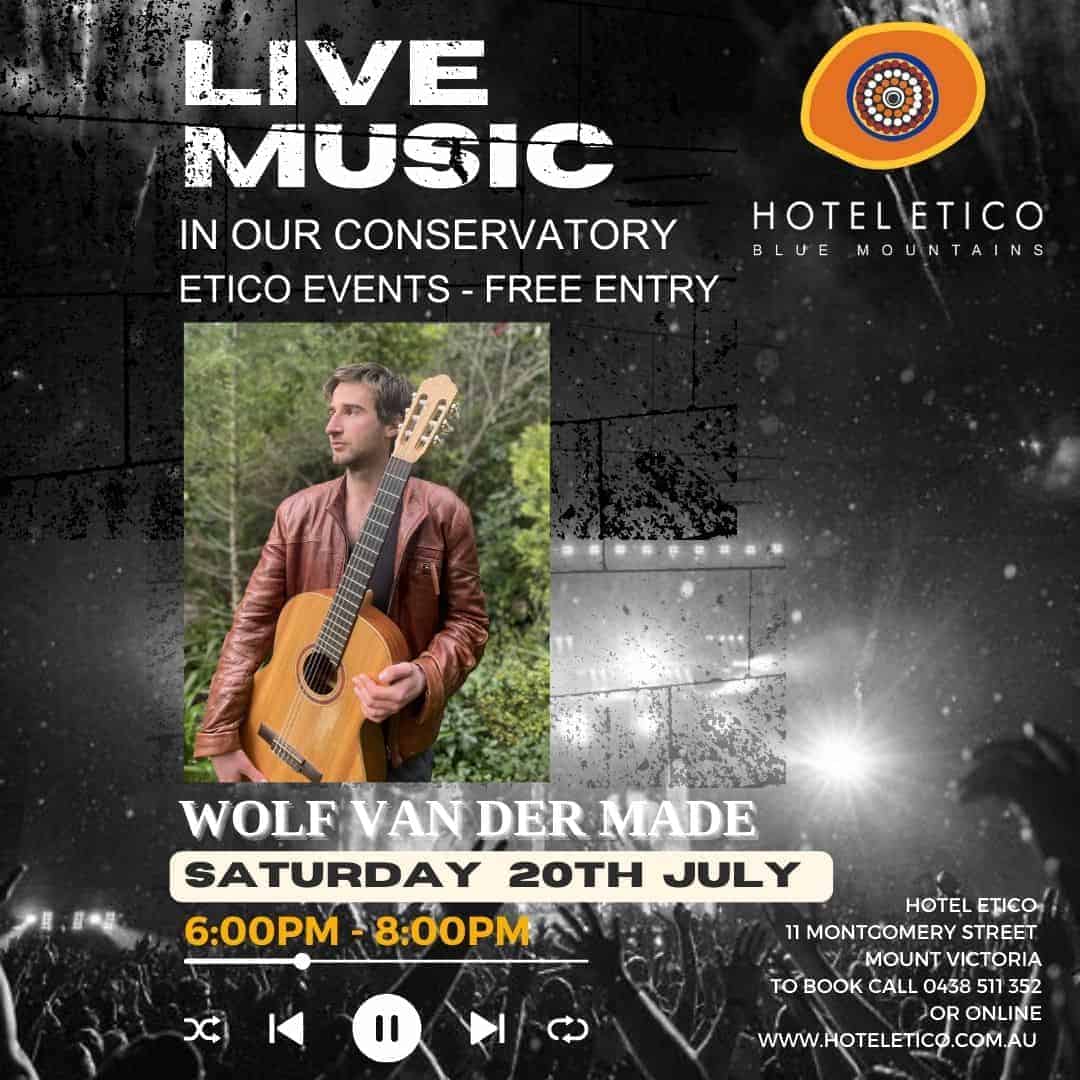 Singer songwriter, composer and arranger Wolf creates a rich original sound with poetic lyrics and intricate guitar finger picking. Originating from the Blue Mountains, Wolf’s music is simultaneously naively pop as well as deeply sophisticated. Immediately accessible and enjoyable, revealing great depths and artistic substance. Wolf has travelled all around Australia. finding inspiration in the country, characters and cultural heritage of his adventures.