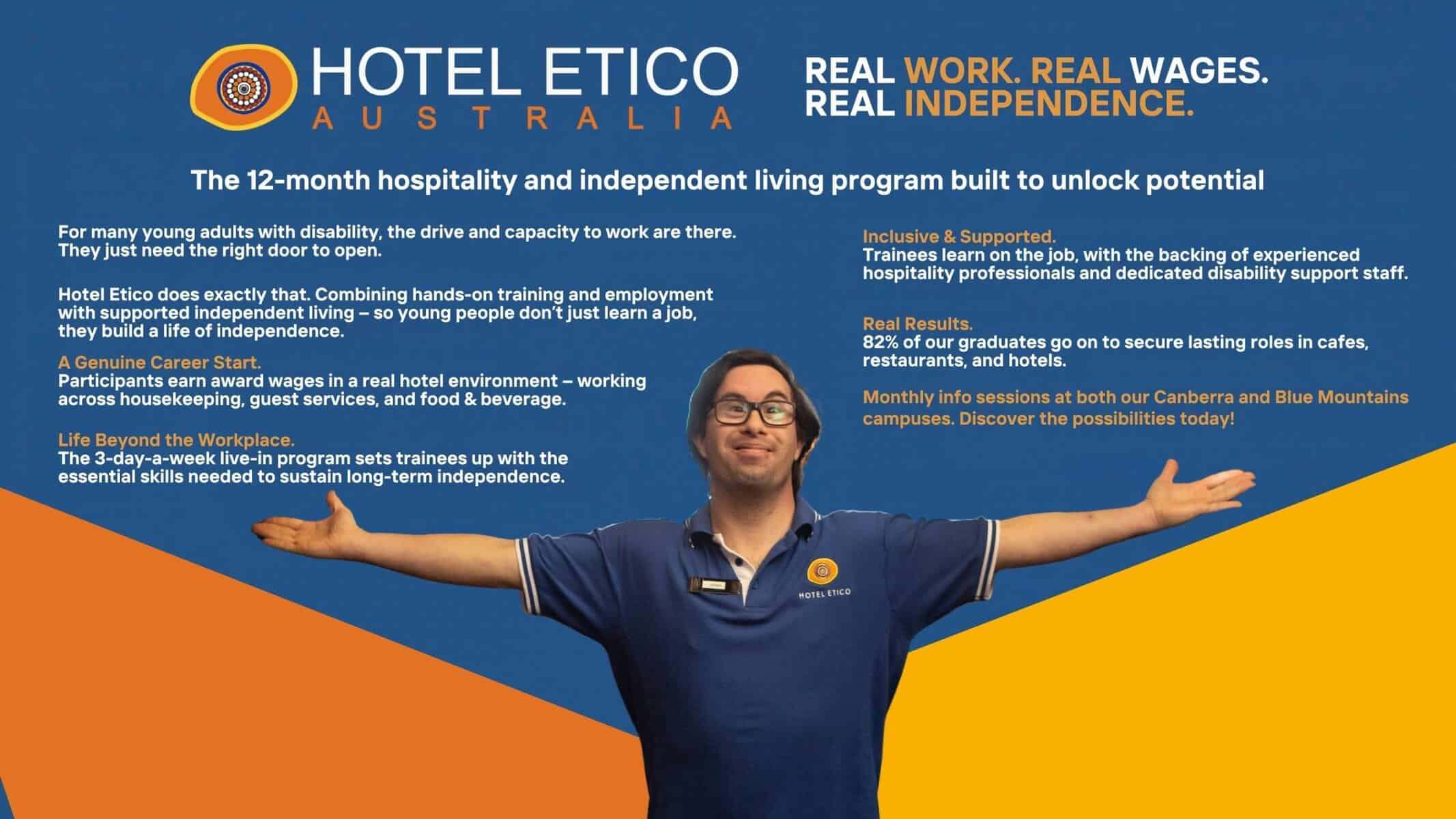 Hotel Etico is Australia’s first social enterprise hotel which means it exists to deliver fantastic holiday experiences to guests that will facilitate a work, training and live-in program for people with disabilities, enabling them to transition to open employment and become more independent.